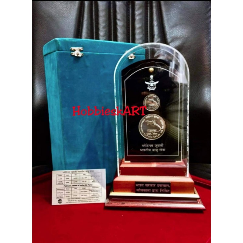 EXTREMELY RARE: :2007, VVIP Proof Set, "Indian Air Force-Platinum Jubilee", Set of 2 Coins, Silver 100 Rupees & 2 Rupees, Kolkata Mint, (RB # 327), with intact in the acrylic Large stand variety.