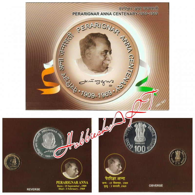2009 - Perarignar Anna Centenary Rare Unc set of 100 Rupees Silver Coin with 5 Rupees Coin at Lowest Price.