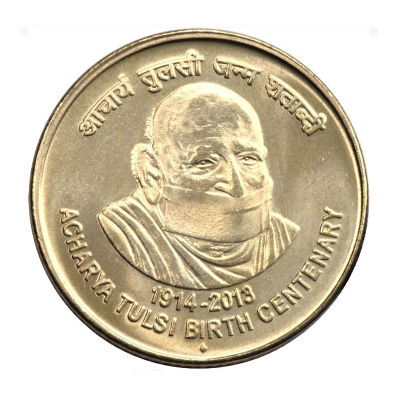 REVERSE:-The reverse of this coin shows the image of Achaya Tulsi in the center. Date ‘1914-