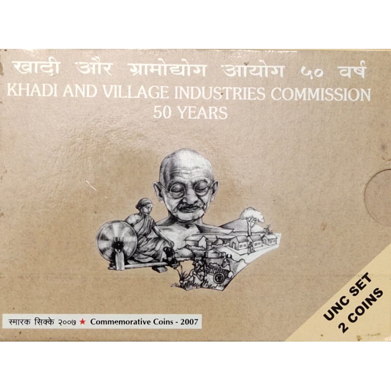 50 Rupees Khadi and Village Silver coin with 5 Rupees Stainless Steel coin in blister pack.