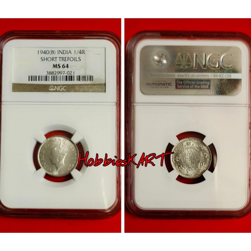 George VI -1/4 Silver Rupee of 1940(B) Rare MS-64 Graded coin.